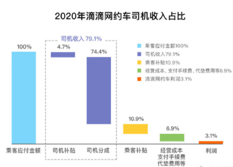 吊诡的是,司机在这边哭诉高抽成,网约车公司则在那边委屈地表示:我真的赚得不多。 5月7日晚,对于近期的网约车“抽成”争议,网约车市场的龙头滴滴发声了。 滴滴说明了以下几件事:第一,抽成真的这么高吗?根据数据,2020年,乘客的应付金额里,其实有74.4%都是司机的分成,还有4.7%是司机的补贴。也就是说司机的收入占比达79.1%。 而另外的20.9%里,有10.9%为乘客补贴优惠,6.9%为企业经营成本及纳税和支付手续费等。只有3.1%为网约车业务净利润。