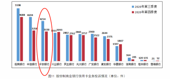 近年来,平安银行的零售业务增长强劲。平安信用卡作为平安零售急先锋,伴随而来的却是高居不下的投诉率。4月15日,银保监会曾发布文件表示,2020年第四季度,平安银行的信用卡业务投诉量位列股份行的第三位。