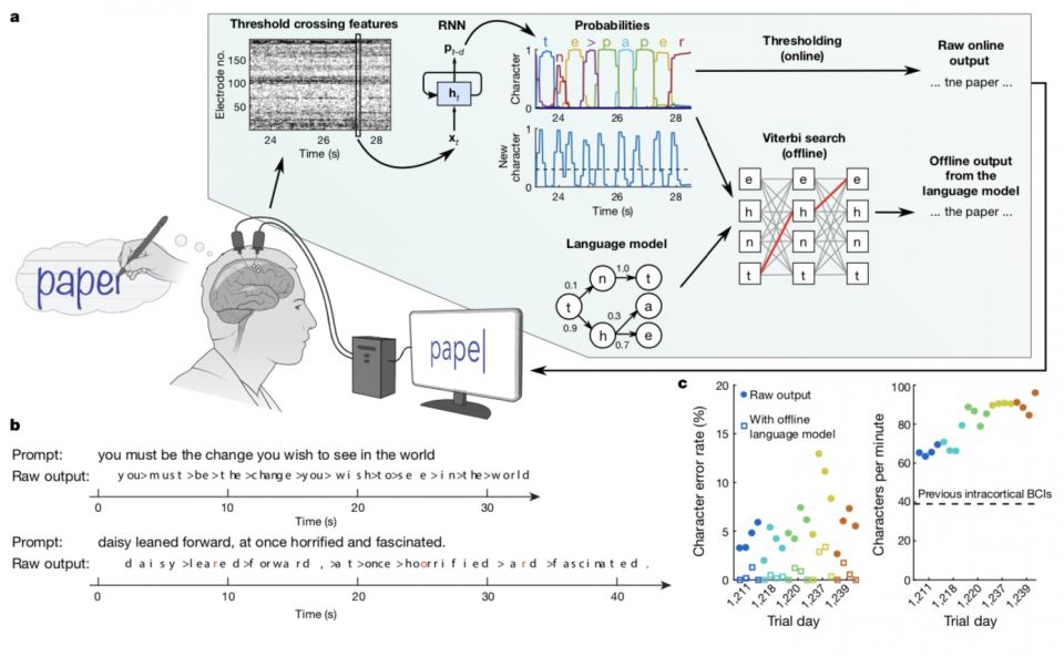 研究团队将人工智能软件与一款脑机接口设备结合起来,与一名大脑中植入脑机接口设备的瘫痪患者合作,让该患者想象他拿着一支笔,在一张横线纸上“尝试”写字,就像他的手没有瘫痪一样。并将该男子手写意图快速转换为电脑屏幕上的文本。