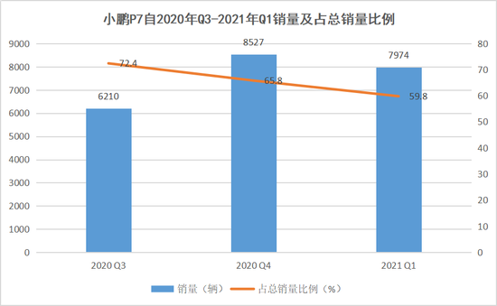 小鹏P7自2020年Q3-2021年Q1销量及占总销量比例,数据来源于财报,连线出行制图