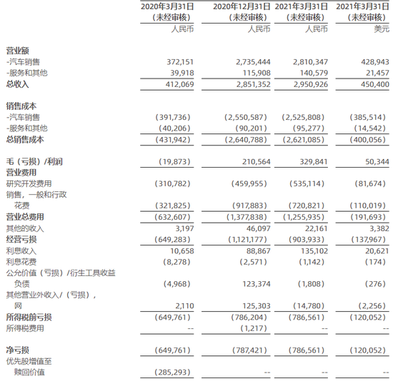 小鹏汽车2021年一季度营收及净亏损情况,截图自财报