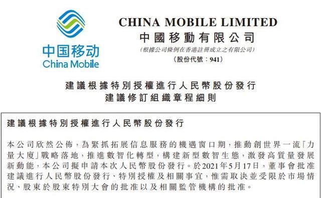 5月17日晚间消息,中国移动公告,为紧抓拓展信息服务的机遇窗口期,推动创世界一流“力量大厦”战略落地,推进数智化转型,构建新型数智生态,激发高质量发展新动能,公司拟申请A股发行上市。据披露,中国移动拟公开发行人民币股份数量不超过9.65亿股(行使超额配售选择权之前)。