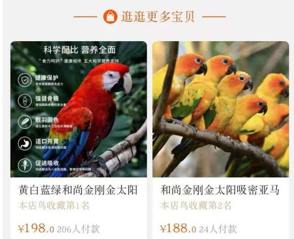 淘宝上有多家店铺标明出售国家保护动物。一家店铺名为“小鸟养殖场”的淘宝店售有“鹩哥幼鸟八哥鸟幼体会说话画眉活物鸟秀眼鸟百灵鸟喜鹊珊瑚鹦鹉鸟”等,其商品封面图上写着“什么鸟都有,联系客服”。客服称,仅支持支付宝交易,看鸟需要加微信。