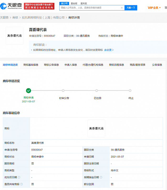 商业 饿了么申请注册“真香课代表”商标 2021-05-19 15:01:15 分享 来源:界面新闻据天眼查APP显示,近日,拉扎斯网络科技(上海)有限公司申请注册“真香课代表”商标,注册号55830647,国际分类为通讯服务,目前商标状态为“商标申请中”。