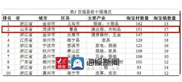 例如,前几年或许你还只知道浙江义乌,但从现在开始,你必须还得知道山东曹县。因为淘宝百强县,义乌第一,曹县第二。义乌主卖小商品,而曹县的支柱产业是演出服,曹县大集镇是山东省唯一一个淘宝村全覆盖的乡镇,这里下辖32个网店村,是全国最大的演出服加工基地,每年承包了全国70%的演出服。像大家看的电视剧中演员穿的衣服十有八九都来自曹县,再加上现在汉服文化的兴起,汉服成了曹县新的支柱产业之一,目前从曹县走出去的汉服已经占了市场份额的三分之一。