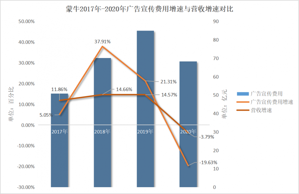 2018年-2019年,蒙牛的广告宣传费用分别增长了37.91%以及21.31%,而公司营收增速则徘徊在15%以下,2020年在减少广告宣传费用的情况下营收增速为负增长-3.79%。