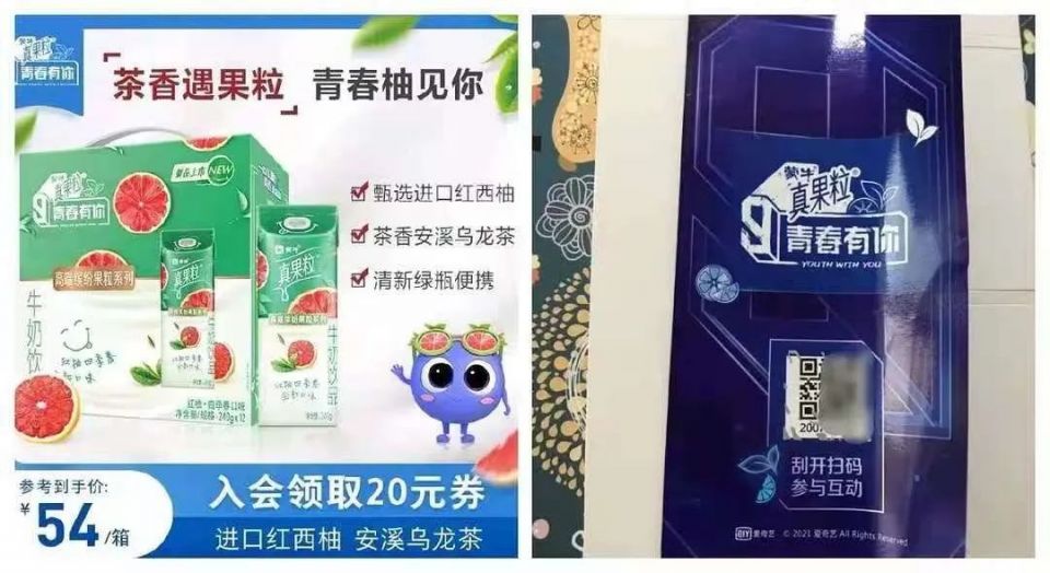 据悉,视频中的乳饮是中国蒙牛乳业有限公司(下称“蒙牛”)旗下的“真果粒”产品,蒙牛真果粒冠名赞助爱奇艺制作的《青春有你3》,粉丝可通过扫描瓶盖上的二维码兑换相应的投票权。