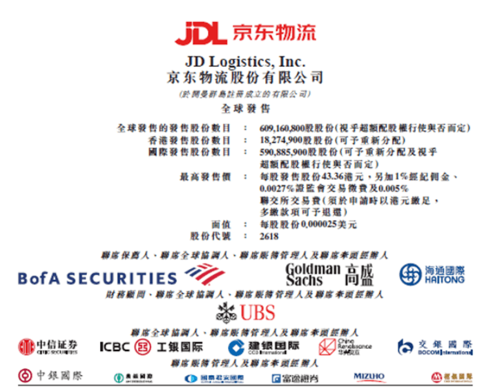 根据港交所披露信息,京东物流此次全球公开发售总计6.092亿股,每股发行价39.36-43.36港元,每手买卖单位为100股,美银证券、高盛、海通国际为联席保荐人。