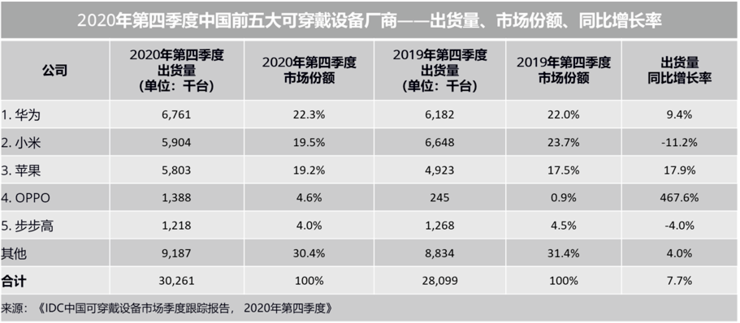 在IDC发布的《2020年第四季度中国可穿戴设备市场追踪报告》中,前五大可穿戴设备厂商更是不见华米踪影。华为、小米、苹果三家就合计占据了61%的市场份额,这意味着华米自主品牌要在本就狭小的市场空间内与众多对手展开新一轮厮杀。