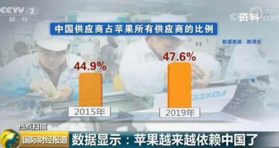 路透社的数据显示,2015年,中国供应商占苹果所有供应商的比例为44.9%;到了2019年,这一比例悄然上升到了47.6%。