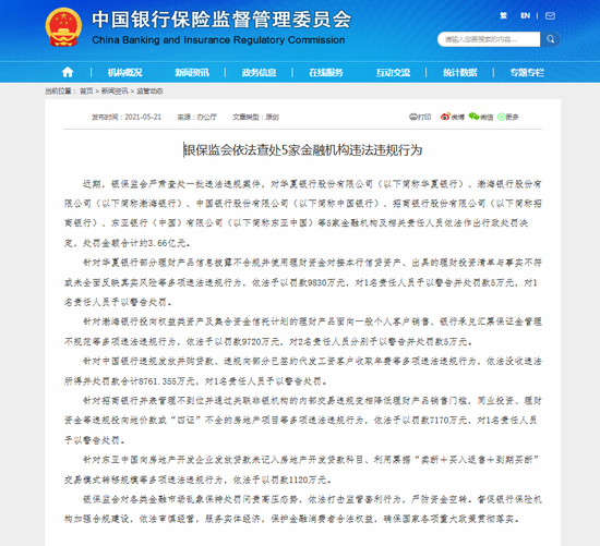 5月21日消息,银保监会发布通报称,对华夏银行(6.440,0.00,0.00%)、中国银行(3.280,0.00,0.00%)、招商银行(54.110,-1.36,-2.45%)、东亚中国、渤海银行等5家金融机构及相关责任人员依法作出行政处罚决定,处罚金额合计约3.66亿元。