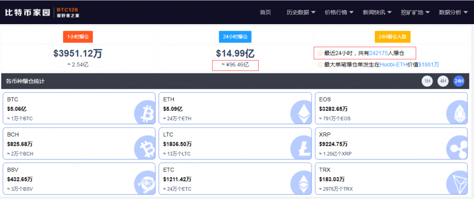 值得注意的是,大幅波动再次造成大量的资金损失。据比特币家园网最新数据显示,最近24小时,共有242175人爆仓,96.46亿元资金灰飞烟灭。