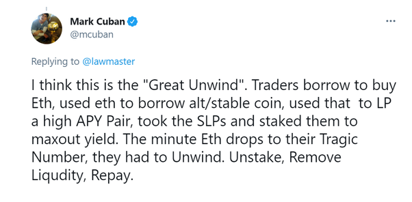 周末加密货币市场的暴跌引起了多头和市场参与者的注意,其中包括亿万富翁马克·库班(Mark Cuban),他似乎在一定程度上将这种暴跌归咎于过度杠杆和对比特币替代品的投机。