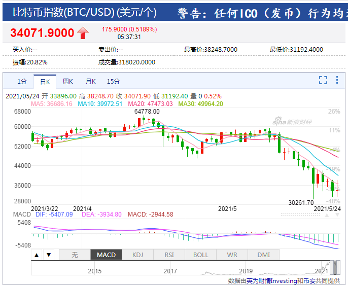 连日来,比特币的大幅波动仍在继续。5月23日,比特币指数又一度大跌16.71%,最低报31192.40美元/枚。截至发稿,比特币收复34000点关口,报34071.9美元/枚,反弹近3000美元。