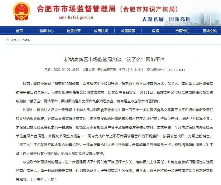 3月31日,合肥市新站高新区市场监管局磨店市场监管所约谈“饿了么”网络平台,面对面沟通外卖平台乱象治理事宜,协商建立政企联合治理机制。