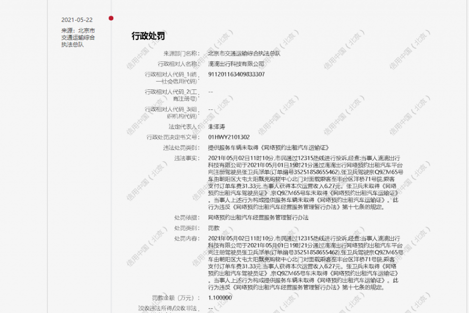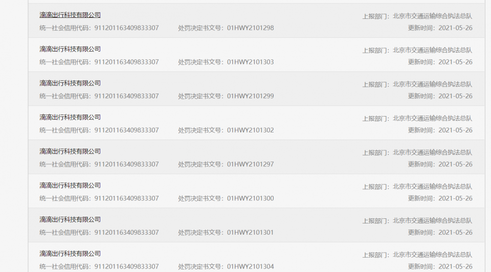 炣燃科技5月27日讯(宁恩)5月25日,潍坊市交通运输综合执法支队对滴滴出行科技有限公司进行了8连罚。