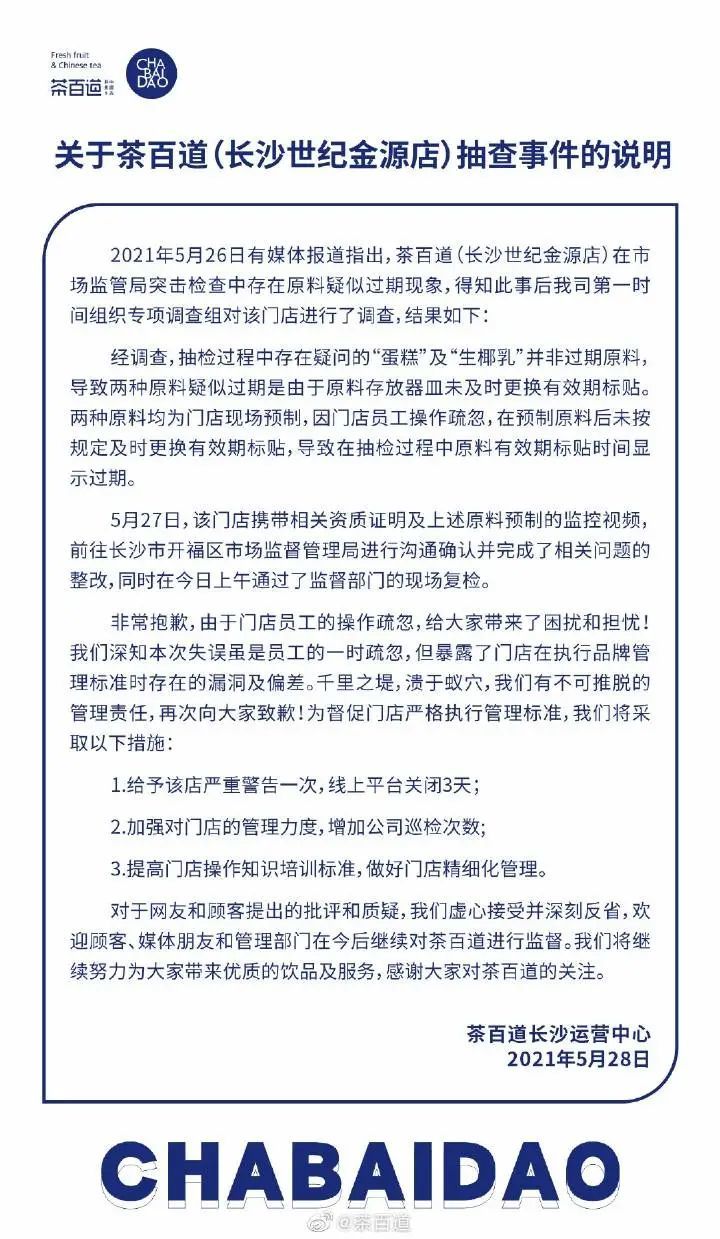 5月28日,针对此事,茶百道在其官方微博发布情况说明称,得知此事后,该司第一时间组织专项调查组对该门店进行了调查,结果如下:经调查,抽检过程中存在疑问的“蛋糕”及“生椰乳”并非过期原料。两种原料均为门店现场预制,因门店员工操作疏忽,在预制原料后未按规定及时更换有效期标贴,导致在抽检过程中原料有效期标贴时间显示过期。