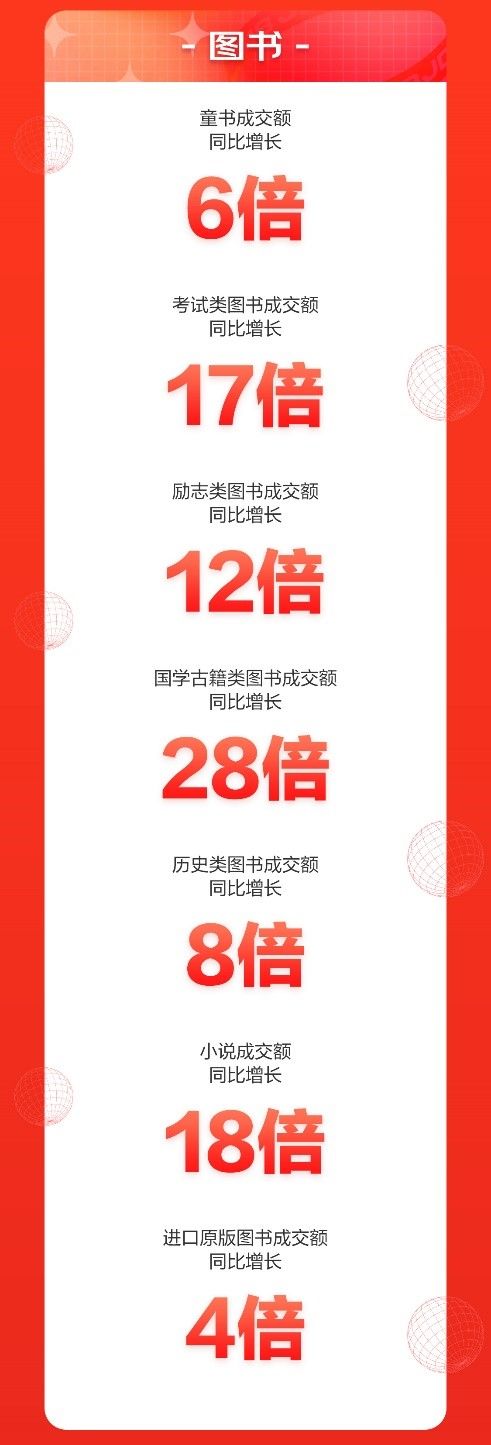 同样在京东618开门红15分钟,小说成交额同比增长18倍,考试类图书成交额同比增长17倍,励志类图书成交额同比增长12倍,这是年轻人默默奋进的消费趋势。