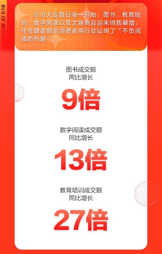 炣燃科技6月1日讯(杨洋)6月1日0点,京东618开门红火爆开启。仅15分钟,京东图书文教纸质书成交额同比增长9倍,展现出了广大读者的阅读激情。