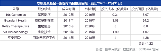 愿景基金一期共投了86个项目,和医疗大健康相关的占了10个。从2016年成立截止去年12月底,愿景基金一期有5个医疗项目上市,共赚了44.22亿美元回报。