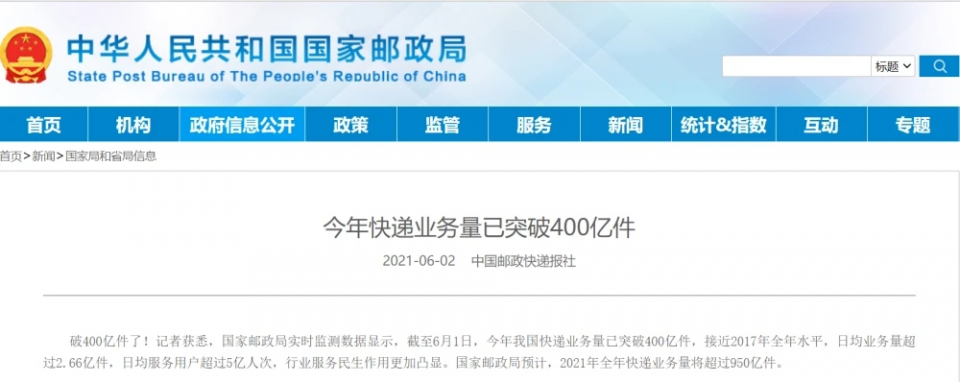 今年快递业务量突破400亿件用时仅5个月,比2017年我国快递业务量首次达到400亿件提前了7个月,比2020年提前约2个月,再次刷新纪录,显现了我国快递市场巨大的发展韧性、蓬勃活力和增长潜力,也彰显了邮政快递业在促进消费和畅通经济循环中的重要作用。