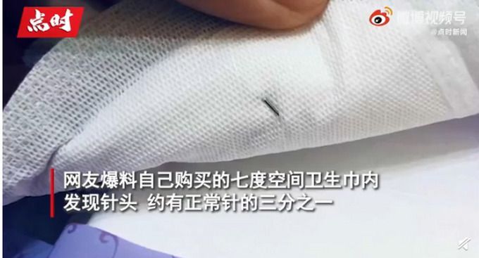 6月5日,江西鹰潭,网友爆料自己购买的七度空间卫生巾内发现针头,约有正常针的三分之一。据当事人唐女士:刚打开卫生巾准备使用时发现有异物,撕开后发现一个针头。唐女士表示,目前只想知道针头存在的时间和原因,也想提醒所有使用者多留意。