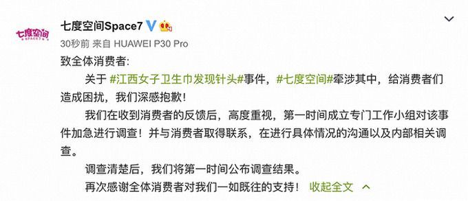 6月6日晚,@七度空间Space7 微博发布公告称:“关于江西女子卫生巾发现针头事件,七度空间牵涉其中,给消费者们造成困扰,我们深感抱歉。我们在收到消费者的反馈后,高度重视,第一时间成立专门工作小组对该事件加急进行调查。并与消费者取得联系,在进行具体情况的沟通以及内部相关调查。调查清楚后,我们将第一时间公布调查结果。”