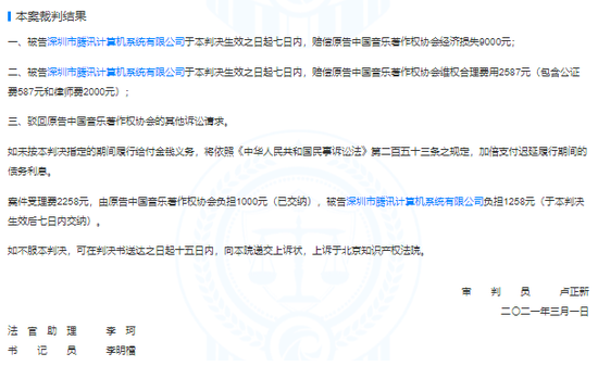 最终判决结果为,被告深圳市腾讯计算机系统有限公司于本判决生效之日起七日内,赔偿原告中国音乐著作权协会经济损失9000元及维权合理费用2587元,共计11587元。