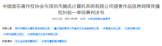 天眼查App显示,近日,中国音乐著作权协会与深圳市腾讯计算机系统有限公司侵害作品信息网络传播权纠纷一审民事判决书公布,案号(2019)京0491民初34502号,审理法院为北京互联网法院。