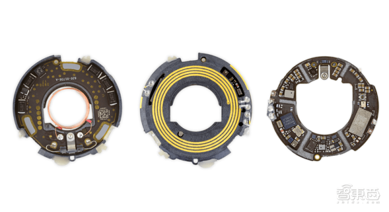 拧下AirTag的后盖、拿出电池、拆掉外壳,AirTag内部的硬件构造就呈现在我们眼前——0.4毫米厚的环形主板上,密集紧凑地分布着大大小小的元器件,这即是苹果硬件设计的一贯风格,也是令许多人感叹苹果工程师牛掰的地方。