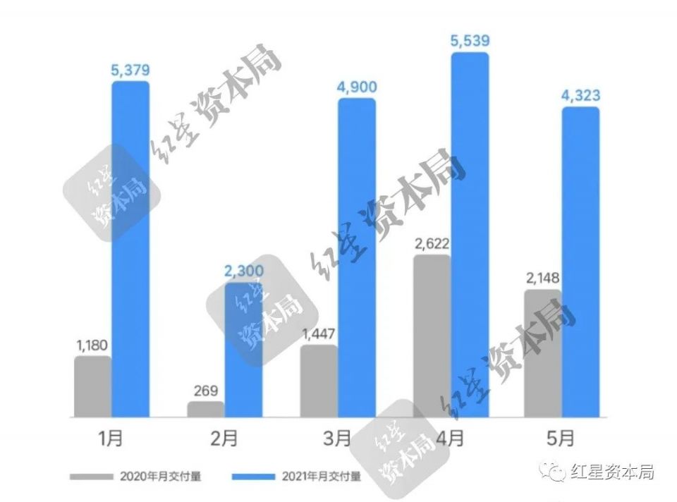 红星资本局注意到,今年4月,理想共交付5539辆汽车,同比增长111.3%;5月共交付4323辆汽车,同比增长101.3%,环比下降21.9%。这意味着,在6月1日新款理想ONE交付前两个月,有接近万名的消费者购买了2020款理想ONE。