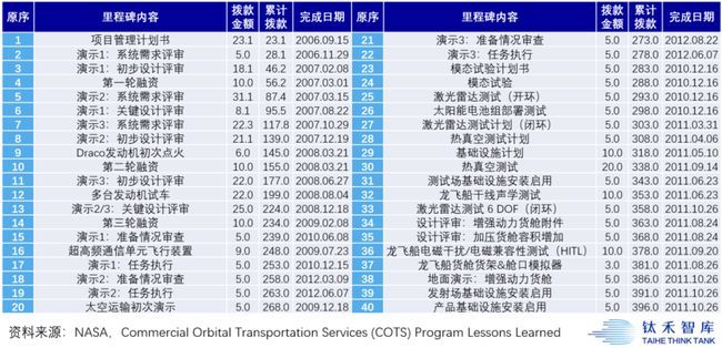 COTS项目中SpaceX里程碑一览(金额单位:百万美元)