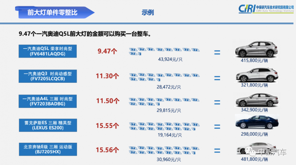 如果将一辆北京奔驰C级轿车的零件拆开卖,能买回8辆整车。而9.47个奥迪Q5L的前大灯就可以买回一辆Q5L新车。近年来,豪华车市场份额不断扩大,但越来越多的人在拥有豪华车之后才发现,修车比买车贵多了。