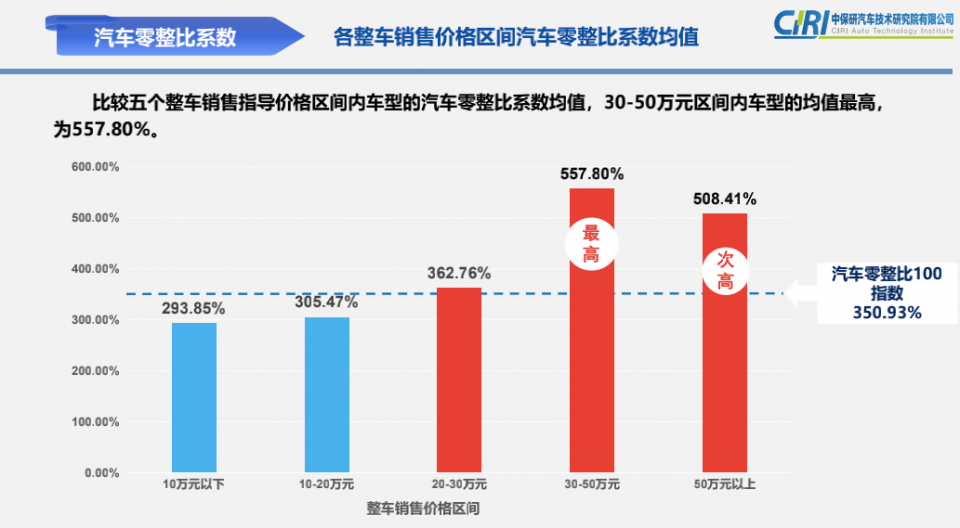 事实上,零整比最高的车型并不是售价最高的奔驰S系、奥迪A8或宝马7系之类,反而是售价集中于30万元至50万元的车型。在此次公布的100款样本车型中,该销售指导价格区间内车型的汽车零整比系数、常用配件负担指数、前保险杠皮单件零整比、前大灯单件零整比均值都是最高。