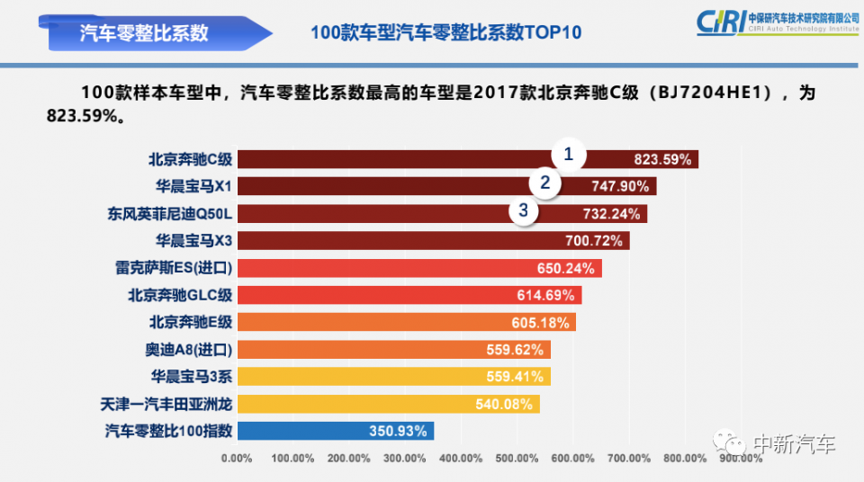 以本期榜单为例,奔驰C级零整比系数最高,为823.59%,而这款车实际购车价格为23-38万之间。尽管多年来奔驰C级轿车稳居零整比榜单之首,但其数据还是在不断下调的。早在2014年时,奔驰C级零整比曾高达1273%,相当于一辆奔驰车零部件能购买12辆整车。经过多年的不断下调,时至2021年,这一数值已经逐步下调至 823.59%。而排在其后的宝马X1零整比也高达747.9%。