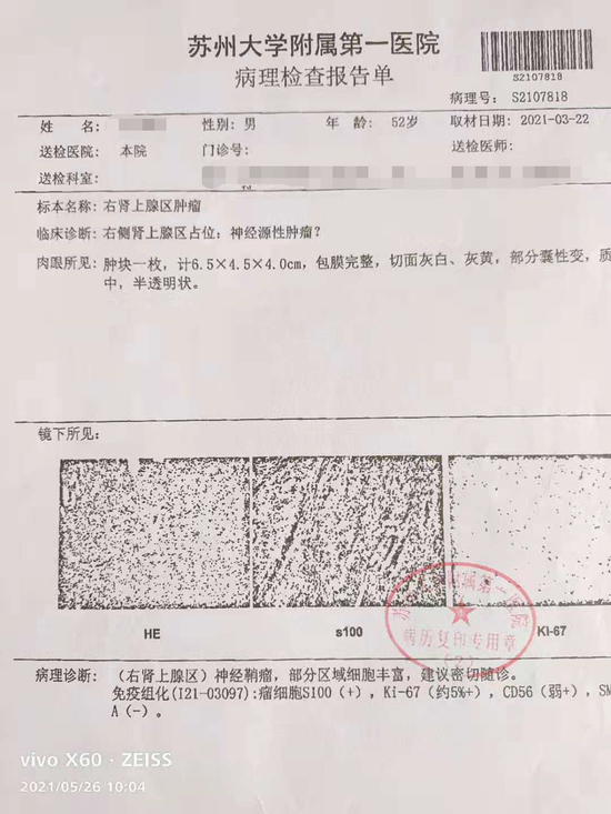 康涛说,合同到手后发现“合同厚厚的一本”,里面还有很多专业内容,当时他并未细看。2021年3月,康涛在苏州大学附属第一医院检测出右肾上腺区肿瘤。根据康涛提供的该院《病理检查报告单》显示,52岁的康涛病理诊断为(右肾上腺区)神经鞘瘤,部分区域细胞丰富,建议密切随诊。