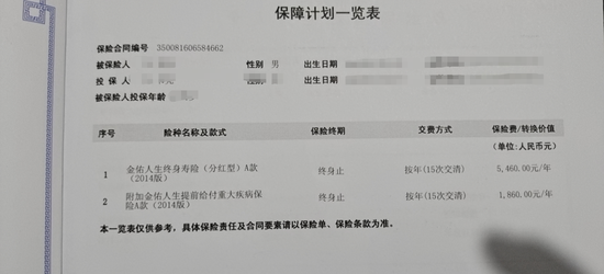 康涛提供的一份《人身保险合同》(以下简称“合同”)内容显示,投保人康涛于2016年9月13日购买了一份金佑人生终身寿险(分红型)A款附加金佑人生提前给付重大疾病保险A款。