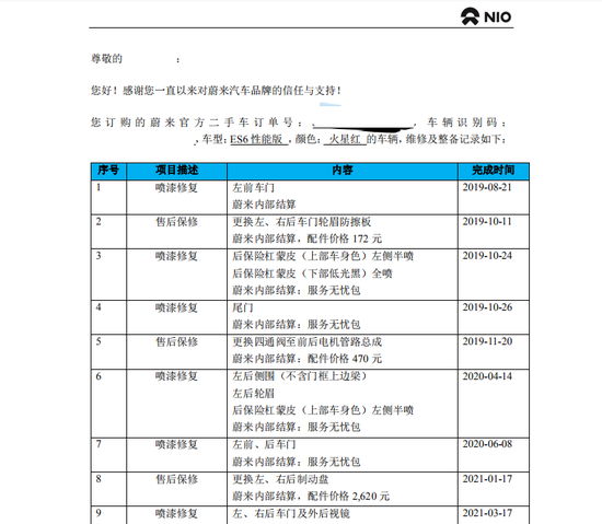 6月8日,蔚来方面向刘先生提供了关于该汽车的详细维保信息的书面资料,该文件指出车辆多处经过喷漆修复,左后轮和右后轮的制动盘均被更换过。