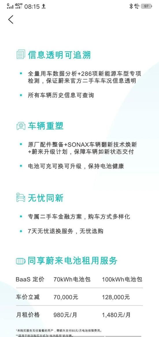 公开信息显示,蔚来于今年1月推出官方认证二手车业务,并声称计划在5年内投资30亿元,为二手车用户提供高质量服务,包括提供7天无忧退换服务。购车后,蔚来官方二手车用户可享受1年或3万公里原厂延保、免费7kW家用充电桩、终身免费道路救援、终身免费车联网,并同享BaaS电池租用服务。