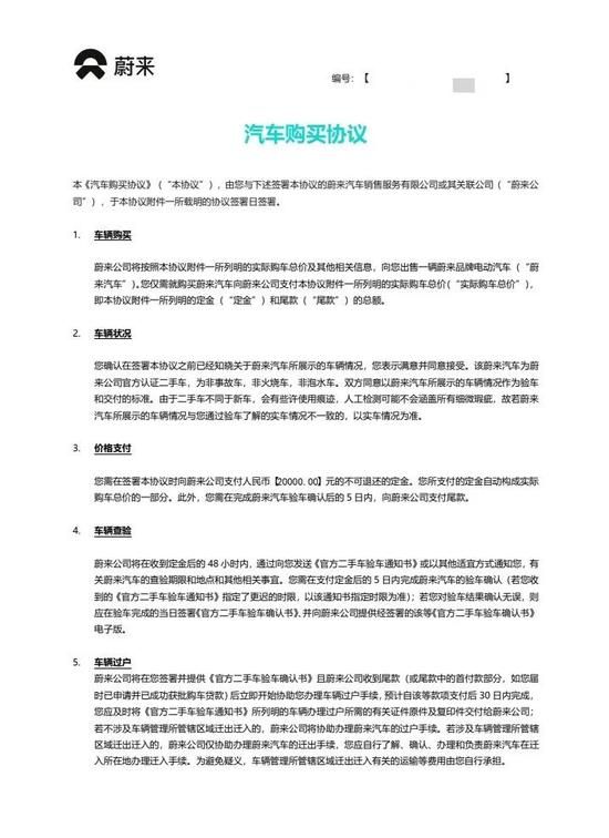根据购车协议,蔚来方面会向消费者提供一份《官方二手车验车确认书》,车主在签署该确认书后才能完成购车流程。不过,刘先生表示,自己至今仍未收到《官方二手车验车确认书》。“买车之前,我们多次要求蔚来工作人员提供车况报告等文件,不过对方一直没有提供给我们,给了钱就说可以把车开走了。”