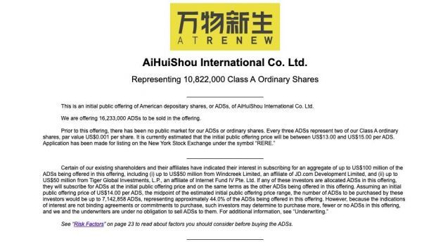 6月13日消息,万物新生集团(爱回收)更新招股书,预计美股IPO定价区间为13-15美元/ADS,预计将发行1623.3万股ADS,高盛、美银、华兴资本、国泰君安国际等承销商另享有243.5万股ADS的超额配售权,若执行“绿鞋机制”后,爱回收IPO募资规模至多为2.8亿美元,IPO估值最高39.8亿美元。6月17日19:00截止认购,预计于6月18日正式在纽约证券交易所上市。