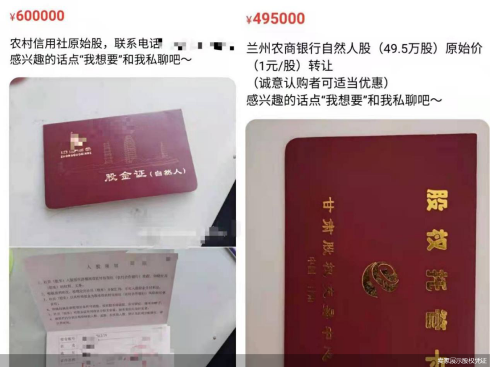 “每年都有分红、配股,年年效益名列前茅,现欲转让变现,买辆好车犒劳一下自己。”另一位自然人股东晒出了他持有的浙江义乌农商行原始股金证,并标注本交易仅支持自提、当面交易。而有的自然人股东只在交易信息中标明了“某地银行原始股出售、有需要的私我”“诚意认购者可适当优惠”等文案吸引投资者。