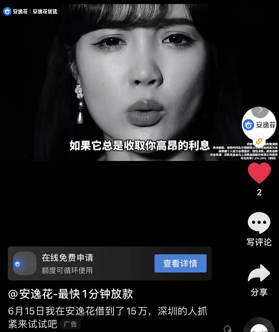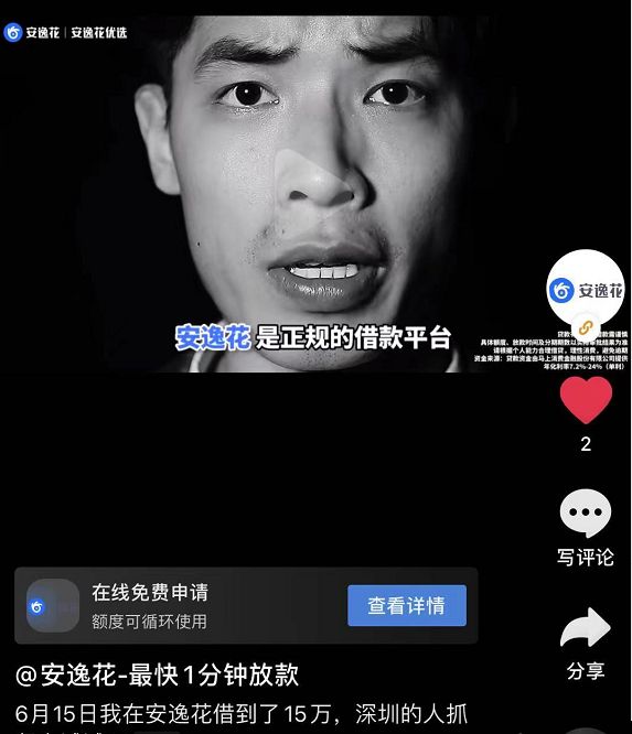 广告一:一位年轻女士蹲在豪车前面,两位路人碎语:现在的年轻人真是,没钱开什么豪车啊。年轻女士摇摇头,给父亲发信息表示要把车卖掉救急。这时一男子过来,在女士手机上操作一番,女士手机里马上就有了很多钱。女士不解,男子表示这是“安逸花”,手机号用得越久,额度就越高,最长12期分期“慢慢还”,“一点压力都没有”。