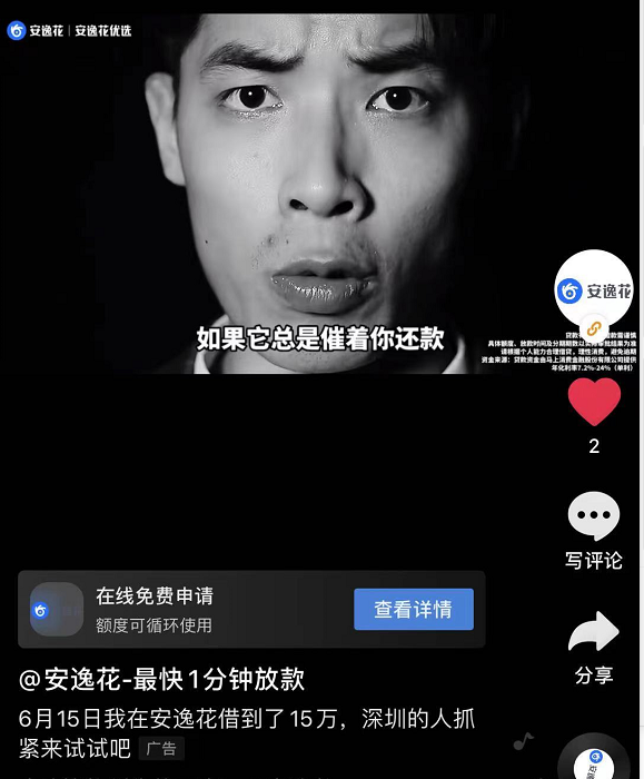 广告二:“你们安逸花是骗人的!”安逸花发布会现场,一位用户冲到演讲台前往演讲者脸上丢了一把菜,怒吼道。就在用户即将被推出现场时,演讲者问用户为什么说安逸花是骗人的。原来是该用户不满安逸花未做到“1分钟放款”,让自己等了三天。演讲者听罢,一巴掌扇向公司员工,并“义正言辞”地表示,安逸花要做区别于市面上的所有贷款平台,为的就是解决用户急需用钱的困境。随后,演讲者就开始宣传安逸花“最高可借20万”“最快1分钟放款”,赢得了现场观众的掌声。