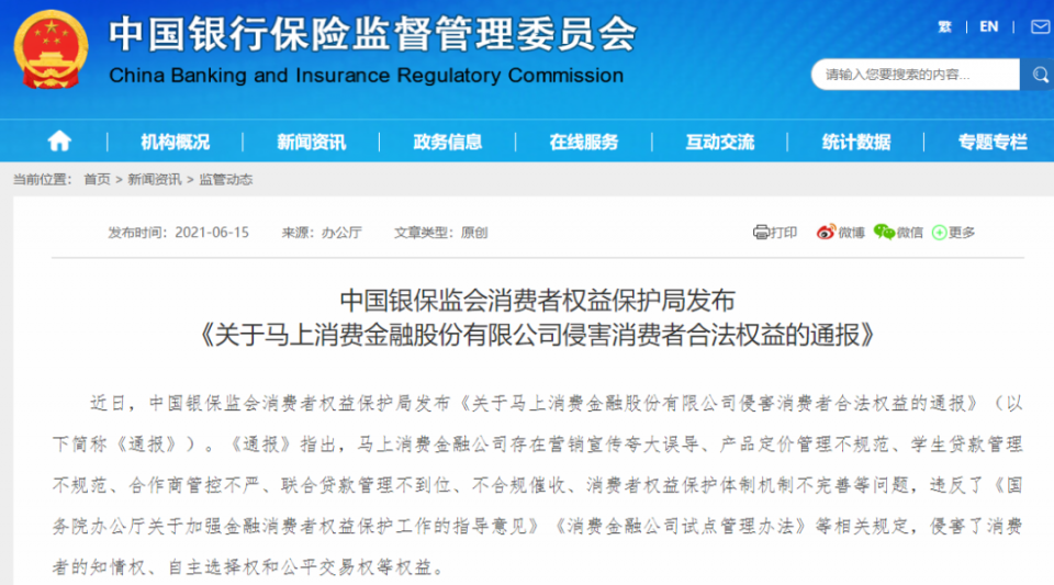 6月15日,21世纪经济报道记者注意到,银保监会官网发布了消费者权益保护局对马上消费金融股份有限公司(以下简称“马上消金”)侵害消费者合法权益的通报。