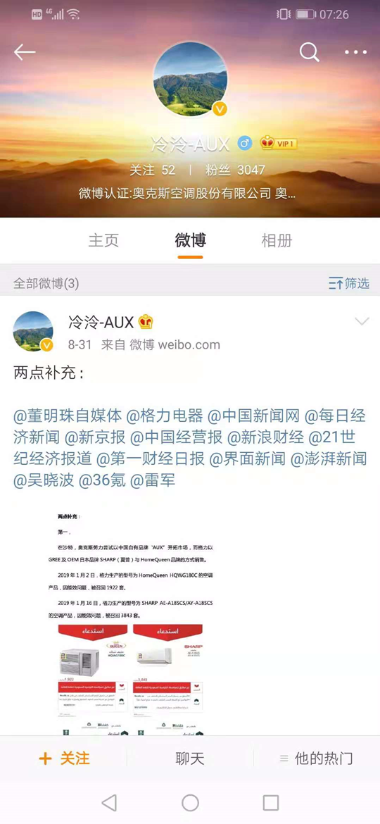 近日,奥克斯高管冷泠在其个人微博发布公开信,表示格力旗下空调有能效不合格的产品,并称将在下周一(9月2日)提供其能效不合格的拆解视频。
