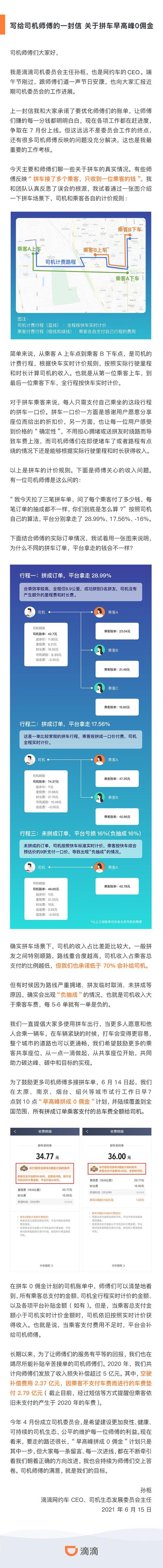 6月15日下午消息,滴滴网约车CEO孙枢今日发布给司机的一封信 ,详解了拼车的计价规则。他同时宣布,6月14日起,滴滴在太原、南京、烟台、绍兴等城市试行工作日早7点到10点“早高峰拼成0佣金”计划,并陆续覆盖到全国范围。