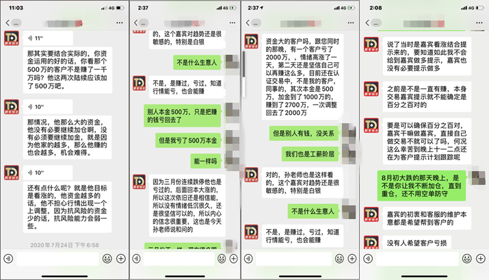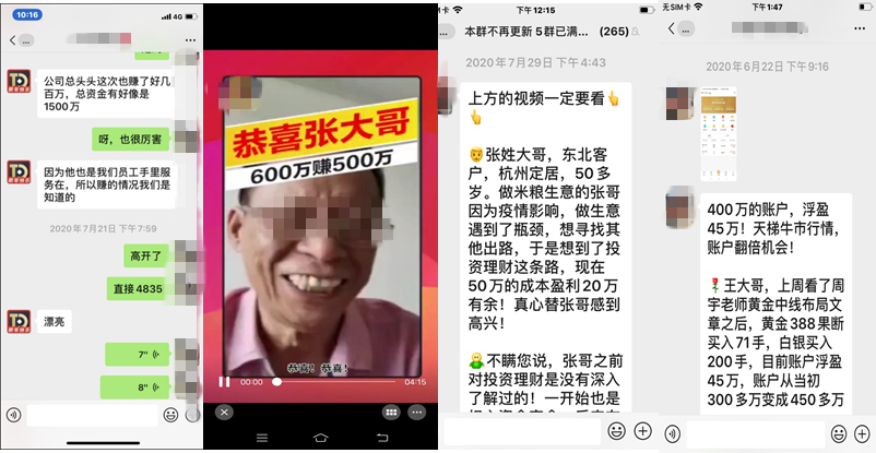 期间,工作人员会频繁向投资者发送盈利信息,营造赚钱效应,比如“申先生从5月份开始跟着老周团队做金银,截止到8月初已经从60万赚到了248万,翻了四番”,再比如“张先生6月23加入内部,300万本金盈利350万”以及“张姓大哥50万成本盈利20万”等。