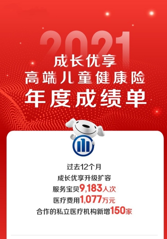 6月16日,在京东618期间,京东安联保险公布了高端儿童健康险产品“成长优享”的年度成绩单,从2020年6月1日到2021年5月31日,“成长优享”升级扩容,服务宝贝9183人次,理赔的医疗费用达1077万元,合作的私立医疗机构新增150家,目前在42个城市达到356家。作为国内率先可为儿童单独投保的高端健康险,“成长优享”提升了儿童就医的便捷性,提高了现有高端医疗资源的利用效率,缓解了公立医院就诊压力,打造了“互联网+保险+医疗”全流程、一站式的服务模式。