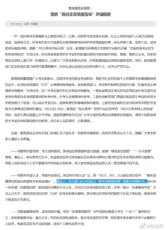 商业 高考志愿规划师并无官方职业资格证:有的并没上过大学 2021-06-19 09:55:09 分享 来源:新浪财经对于各种机构假冒专家身份,教育部6月16日发布预警称,有关部门从未发放过“高考志愿规划师”等职业资格证书。预警通告还称,某咨询机构打出广告,称“与C9、985、211院校成功牵手”“著名部属高校权威志愿填报专家组成团队”,该机构一些所谓“志愿规划师”都是临时招募的社会人员,只经过几天培训就匆匆上岗,还有一部分“志愿填报专家”并没上过大学,按照总部培训过的“台词”给考生和家长辅导。